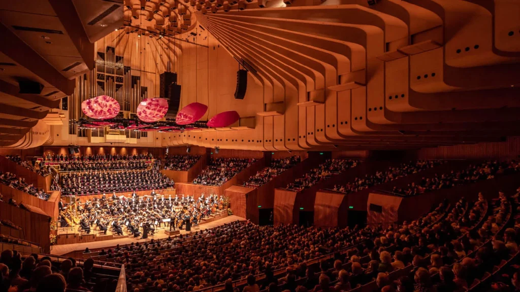 Inside, the complex contains several performance spaces, including a large Concert Hall of about 2,700 seats and the Joan Sutherland Theatre, which seats just over 1,500. Additional smaller theatres and an outdoor forecourt host plays, film screenings and open‑air performances, together supporting well over a thousand events each year.
