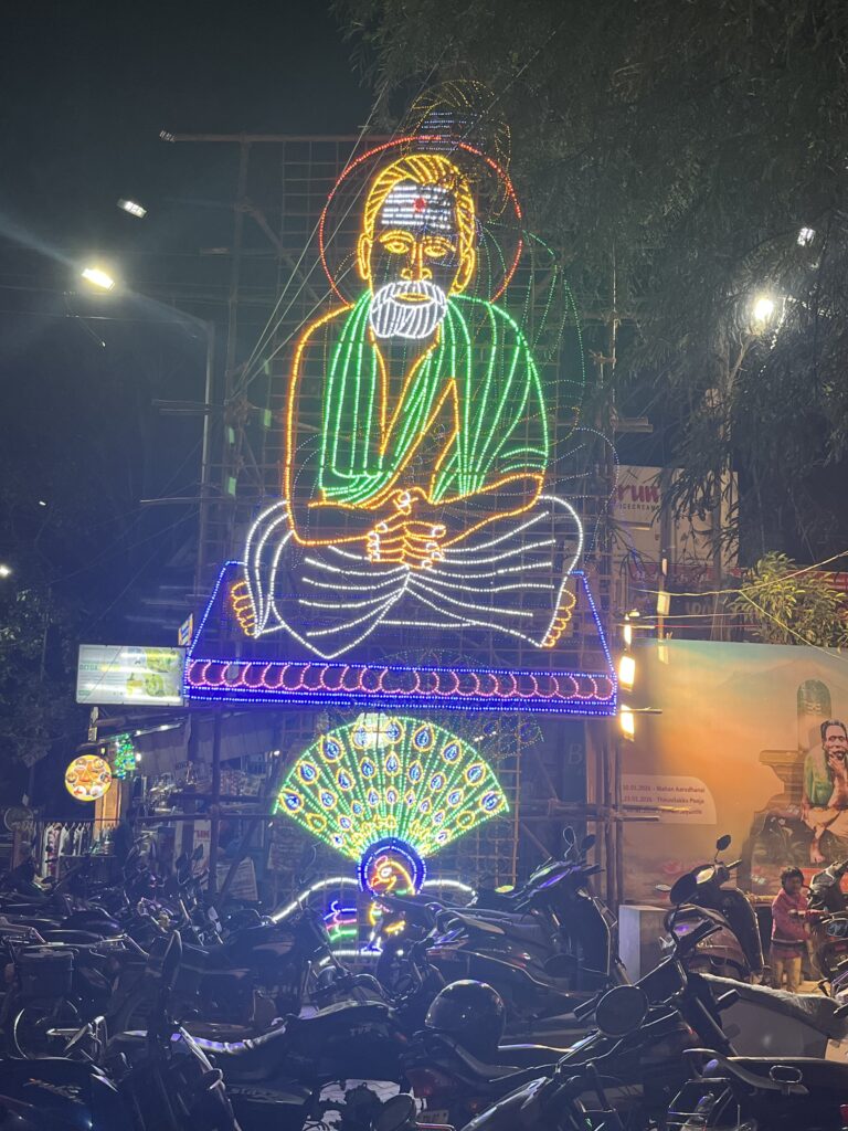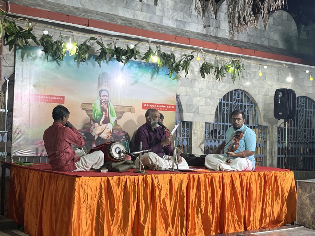 Later in the evening, I spent some time in the Ashram, listening to the Tamil Parayana. I met Sarah outside, and we had a Dosa in Hotel Ananda Ramana. There was cake in my mind! We walked to the German Bakery, where they would have some. Sarah had to make a phone call with England while I had a delicious blueberry cheesecake. After her call, Sarah arrived. We walked back, and in the Shri Seshadri Swamigal Ashramam was some live music.