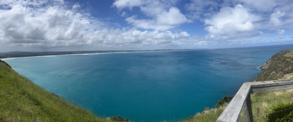 Back on the road. We were driving towards Portland today. After 30 km, we crossed the border to Victoria. The time is 30 minutes ahead here. Before Portland, there would be some interesting sights to visit. The first one would be the Seal Colony at Cape Bridgewater. We stopped close to the ocean and had a coffee first. From there, it was a 45-minute walk to the Cape, through a small forest along some meadows with sheep.