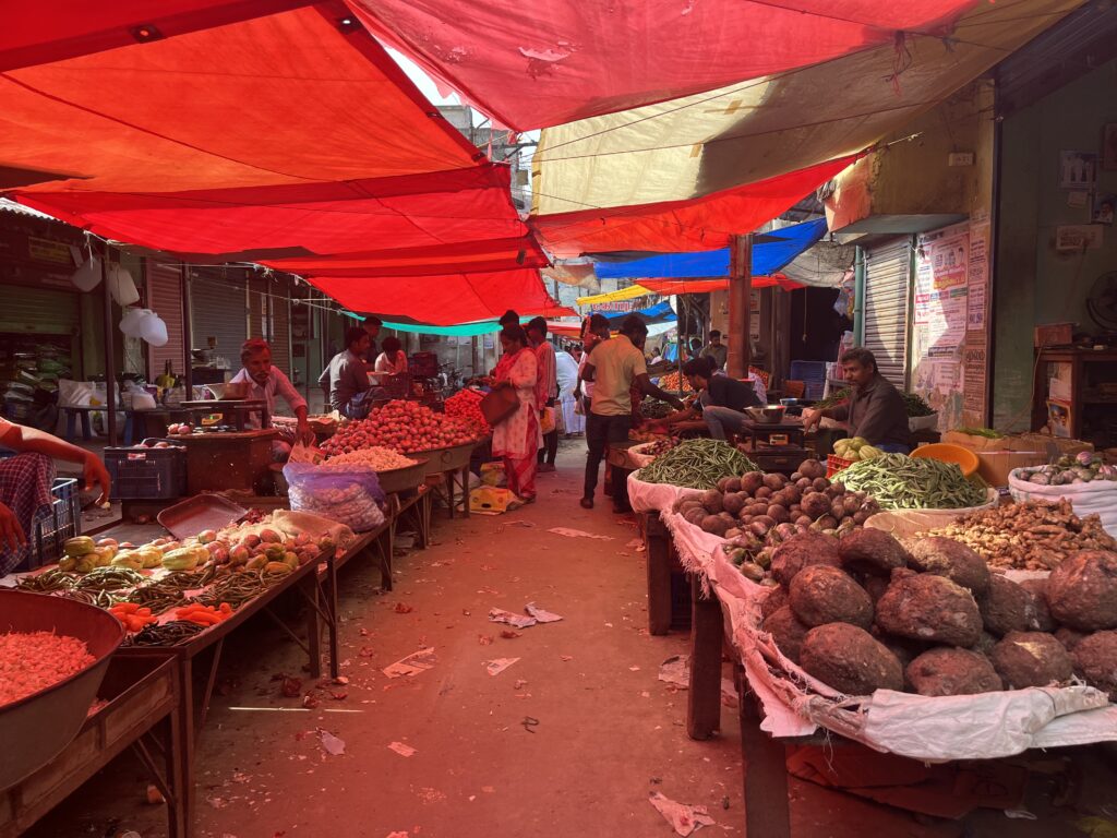 I got a message from Sarah. She was asking if I am in a peaceful place now, she is just walking towards the Ashram. I said we can meet there. It was past 11:00, so the Ashram was closed. It is always closed between 11:00 and 14:00. Sarah had issues withdrawing money at some ATM. So we were driving to an SBI (State Bank of India) ATM near the Ashram. But her card was not accepted there. It was a Master Card. So we had lunch first in a small Restaurant connected with a temple. The Thali there was only 80 Rupees. Then we were driving more into town and tried a few other ATM’s before it was successful. On the way back, I saw a vegetable market and stopped. We were strolling through the market, and I got some tomatoes and a cucumber.
