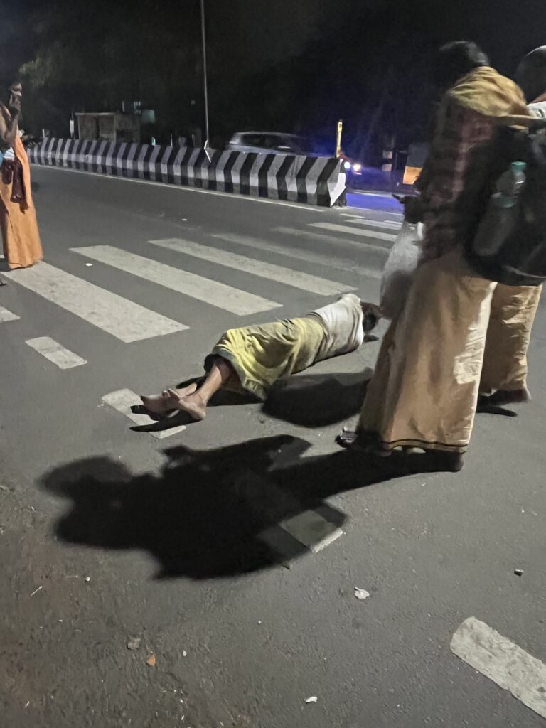 After I withdrew some more money from the SBI ATM to pay the dentist and my rent. I stopped at the supermarket for some snacks and food. On Chengam Road, I saw a man rolling his body on the road.