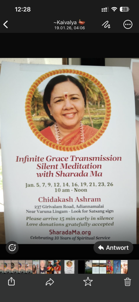 This morning, I will join Satsang with Sharada Ma. The Chidakash Ashram is on Girivalam Road near Nandhini’s Cafe. I have never been here before, nor have I met Sharada Ma before. I am just trying and experiencing new places, new people… At the gate, a German gentleman welcomed me and briefed me on the Satsang, which means he explained what I have to expect here, technically speaking. Of course, all will be according to my own experience.