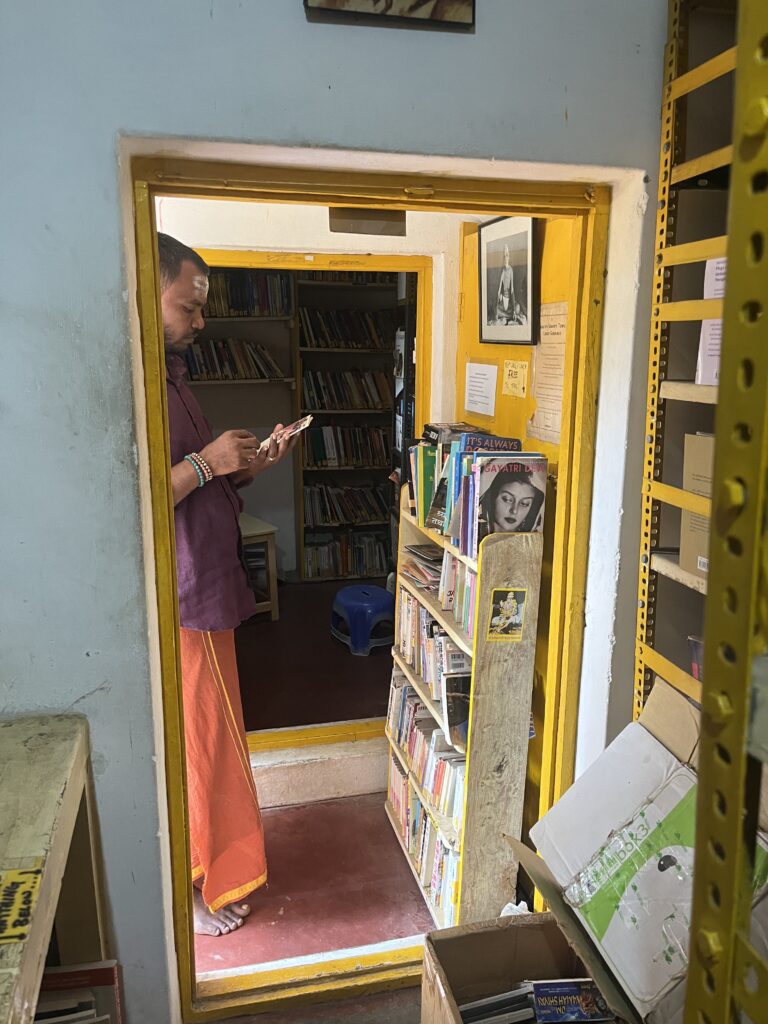 We were driving back to have a chai opposite the Ashram. Then he wanted to show me the small temple near Ramana Ashram. There is also a library he mentioned. I said that I have the code to open the lock. So we entered the small library, and he could borrow some books.