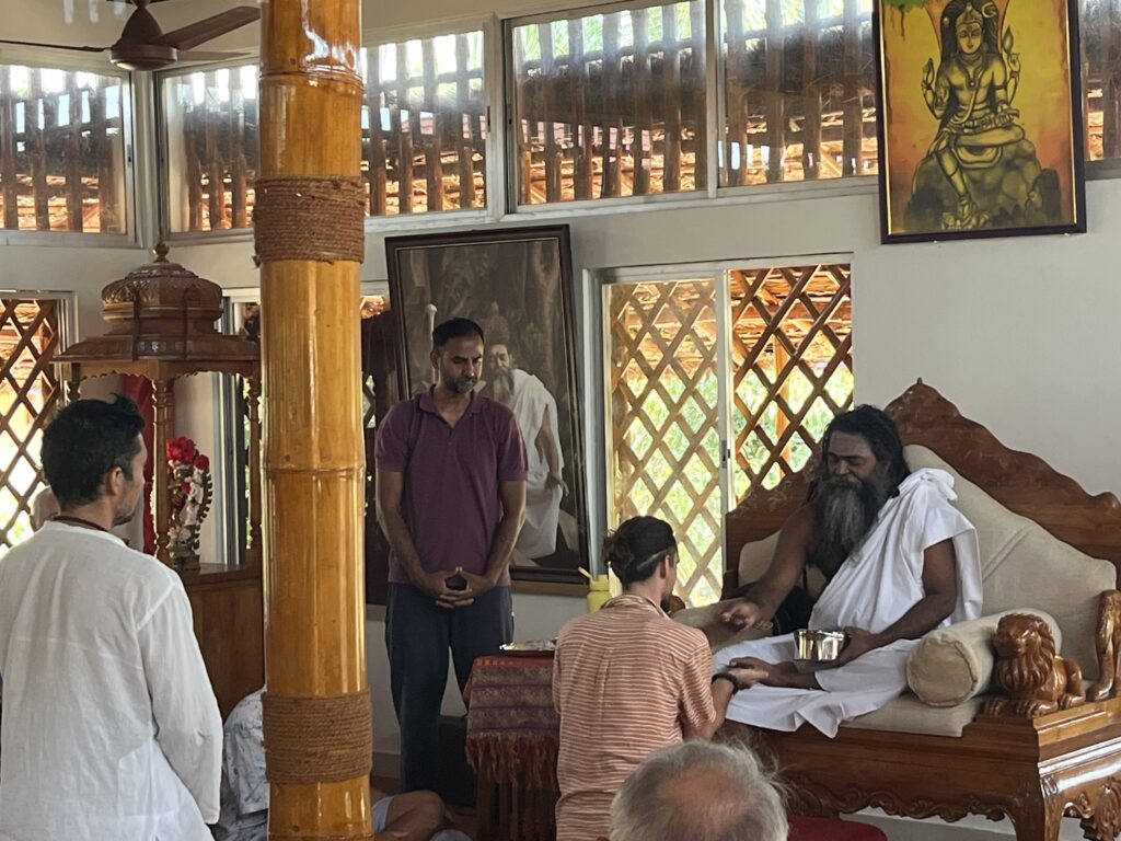 Om Amma couldn’t walk by herself, and I was not sure if she was blind. When she sat down, she started slowly moving her hands. Her body started moving as well, until she was in full rhythm with the music and chanting. Her eyebrows were moving up and down. This was the moment when I realised that there was conscious life in her, and she was enjoying it. I have heard that she has been in a constant state of Samadhi since she was very young. I couldn’t find much history about her yet. Om Amma was only for 30 minutes there, then the Sadhu brought her back into her room. The music continued for a while; it was a strong experience for me, and the room was full of her energy.