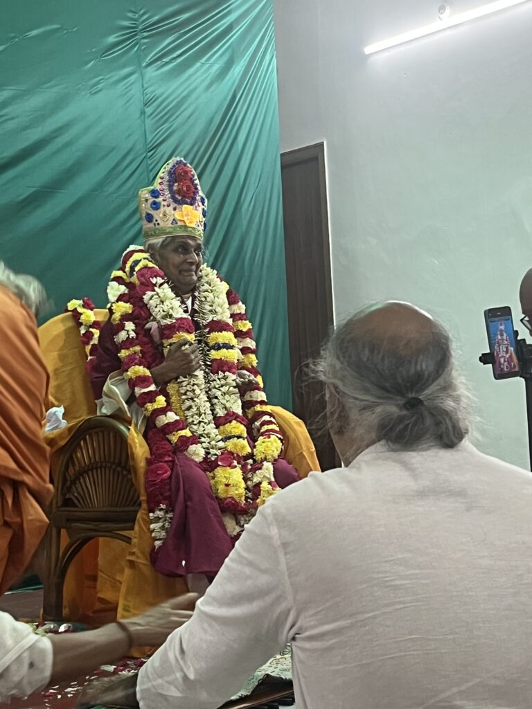 Today will be a full day. At first, there is Satsang with Kollur Swami. It’s around 20 minutes to drive. Lokesh wanted to join me, so I picked him up on Perumbakkam Road. He didn’t know that we were going there. The plan has changed, as yesterday I thought we had Tuesday and not Wednesday. But he wanted to join, so we were driving there. We reached the Ashram after 09:00. There was still time to sit outside and enjoy the silence. Satsang felt very peaceful. After 30 minutes, it was time for questions. Some people had a question, and Kollur Swami would answer them. After Satsang, there was a line. Whoever wanted to could bow down in front of him and receive some nuts. It’s just a common ceremony for devotees.