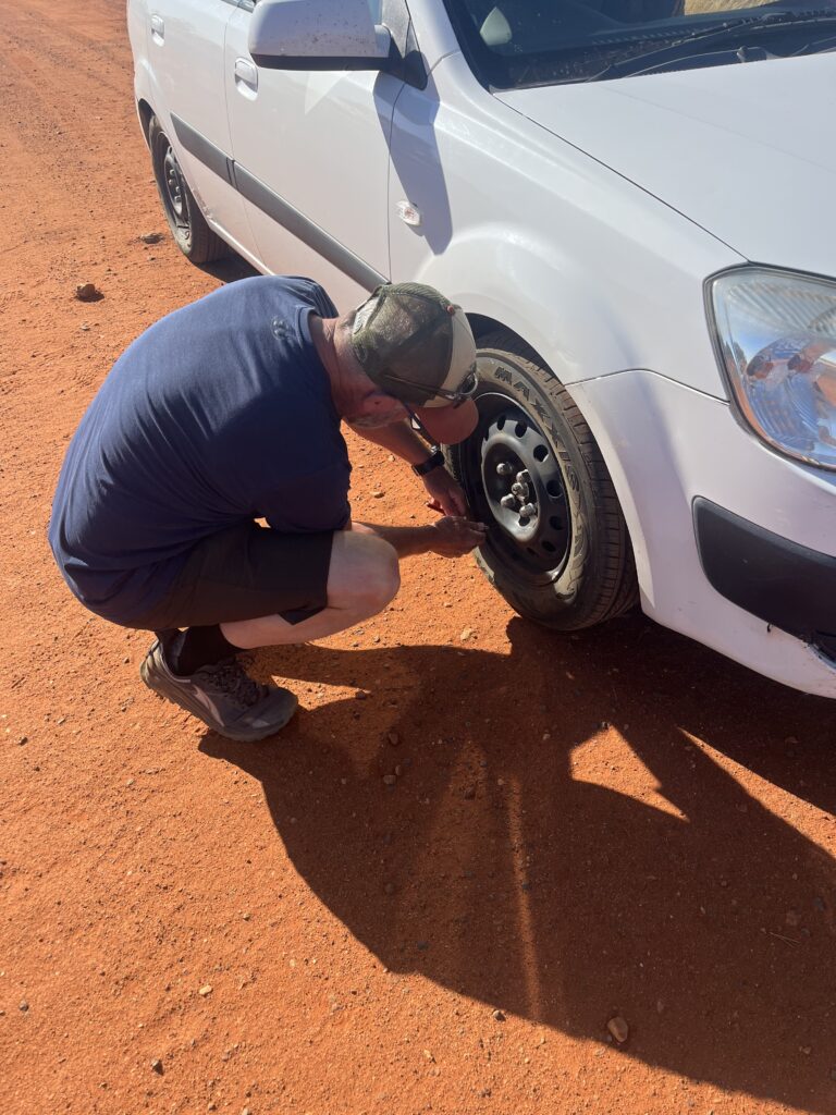 Sometimes it was red sand, which is very dominant in the outback, and sometimes we had to drive on a gravel road. The road was better than I had expected. When Andrew was driving here last time, it was not good as now. We had the windows closed because all the dust would come in. Whenever a car or truck came from the other side, there was a huge sandy cloud. But it got pretty warm in the car, we had to start the air conditioning.