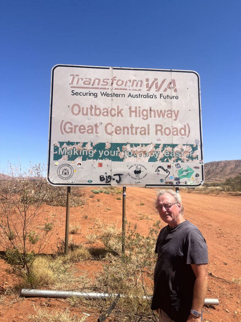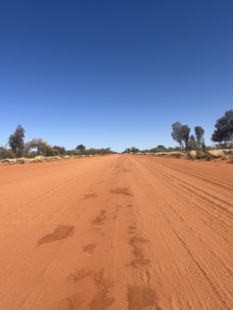 We left Ayers Rock Campground early, just past 07:00. eating a banana and some dried fruits. The Service Station was nearby, so we stopped and got a coffee there. The direction was the same as to the Olgas the day before. At one point, we had to turn left towards Western Australia. After 100 km, the asphalt ended and the dirt road began.