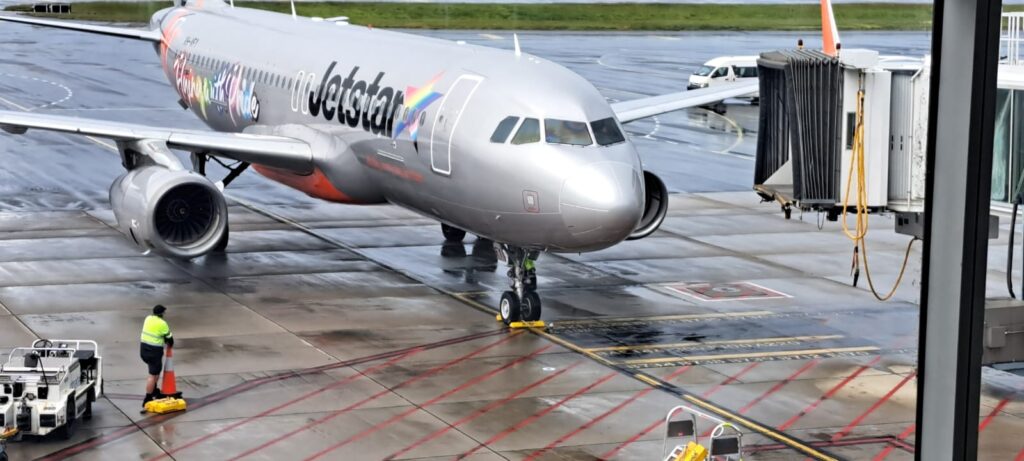 At the service center, I asked where to proceed to domestic departures. Caused by a delay, I missed my Jetstar flight to Adelaide. At Terminal 4 was a Jetstar counter. I could buy a new ticket for AUD 90 (€50). The plane would take off at 09:40. I got a boarding card and checked in my luggage at a self-service terminal. It was time to pass the security and have a coffee. The plane took off in time.